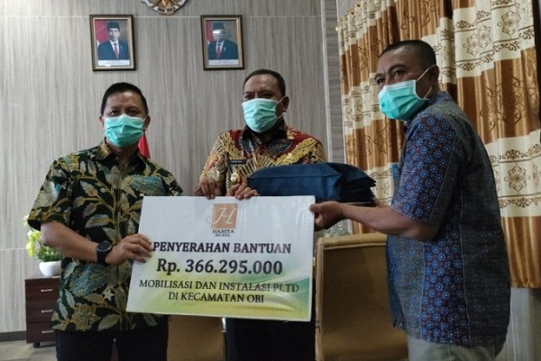 Bupati Usman menerima bantuan dana memobilisasi dan pemasangan PLTD itu senilai Rp366 juta dari Direktur Utama PT Trimegah Bangun Persada Donald J Hermanus mewakili Harita di Kantor Bupati Halsel, Maluku Utara, Kamis (24/6/2021).